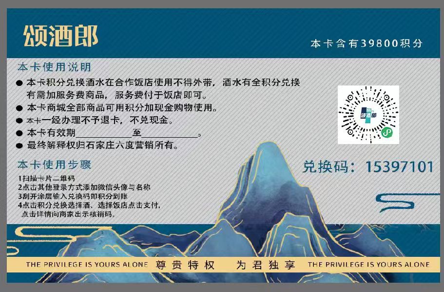 3.此卡积分兑换酒在合作饭饭店根据酒不同需加0至50元服务费。