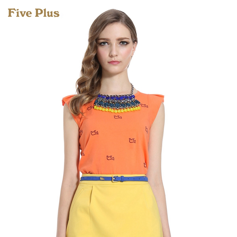 商品名称:Five Plus新女夏装潮图案拼接荷叶边纯棉圆领无袖T恤2131024760 桔红190 L