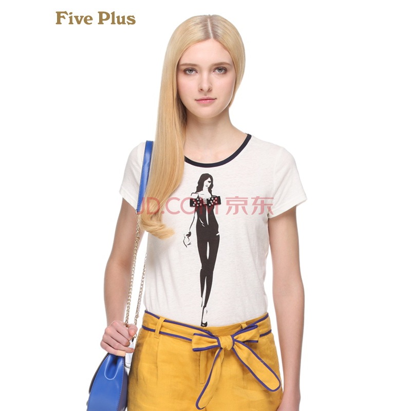商品名称:Five Plus新女夏装欧美时尚棉麻印花图案圆领短袖T恤2131023330 米白010 M