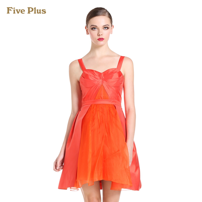 商品名称:Five Plus新女春装拼接修身高腰吊带连衣裙小礼服2144086420 橙红140 M