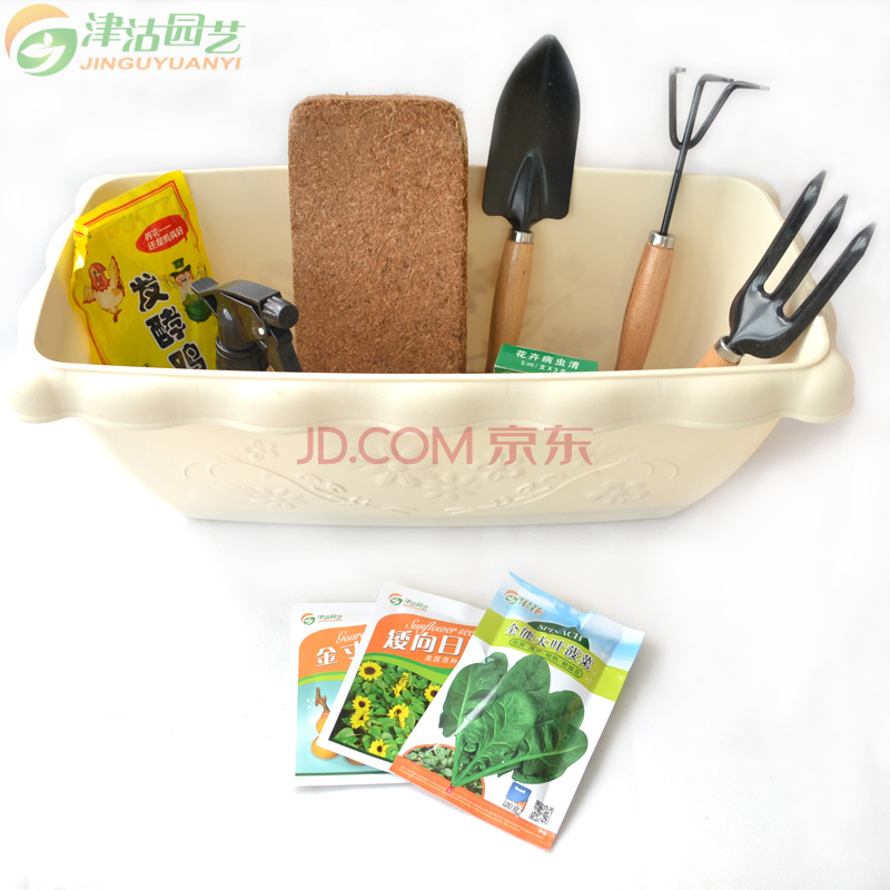 商品名称:津沽园艺 家庭种花种菜套装 含环保树脂大花盆+椰砖+发酵鸡粪肥+喷壶+铲锹耙工具+种子1套