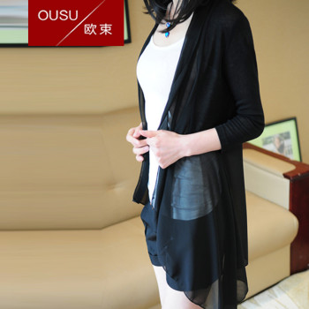 商品名称:欧束 2014夏装防晒衣防紫外线中长袖透明外搭开衫夏季薄空调衫开衫6352 黑色 均码